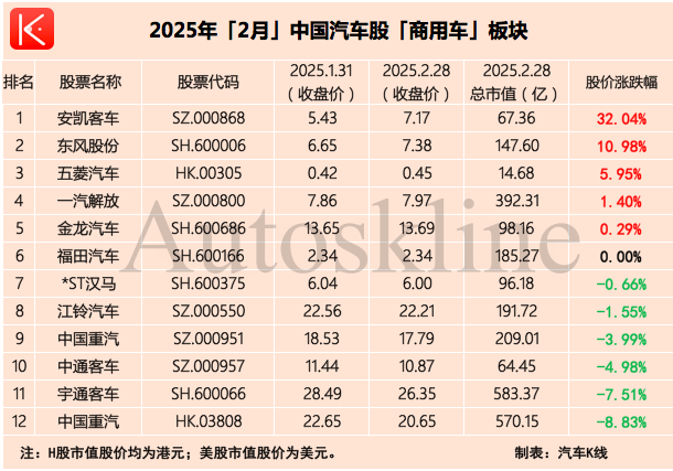 增长潜力相对有限,且受到宏观经济环境和政策调控影响较大的商用车板块,则因市场对其未来发展预期较为保守,整体表现相对疲软,2月平均股价仅实现了1.93%的上涨。