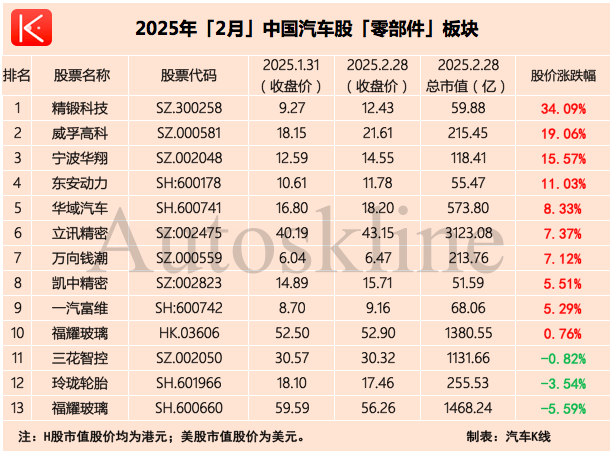 相比之下,同为供应商的零部件板块则略逊一筹,2月平均股价上涨8.01%,且呈现出明显的分化。例如精锻科技和威孚高科(维权)分别上涨了34.09%和19.06%,而福耀玻璃A股下跌了5.59%,显示出市场对高端技术和创新能力的重视。