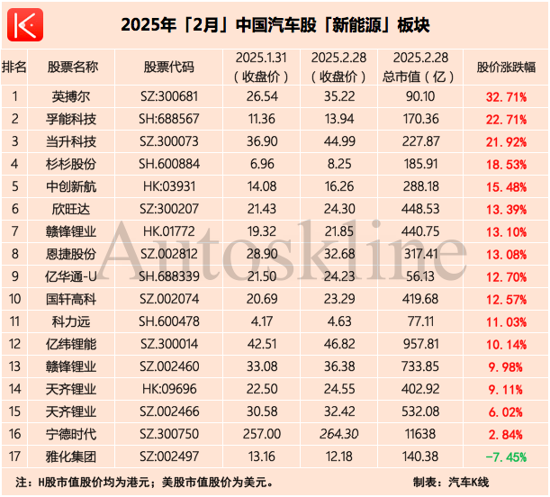 得益于板块仅一只个股飘绿,叠加英搏尔、孚能科技、当升科技等涨势较好个股拉动,该板块2月平均股价大涨12.82%,仅次于智能化/智驾板块。