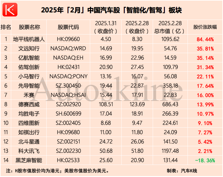 分板块来看,智能化/智驾板块表现最为突出,尤其在地平线机器人、文远知行和亿航智能等个股强力拉动下,该板块2月平均股价大涨19.51%。