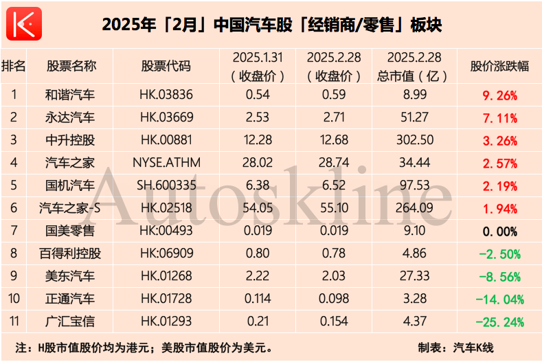 引人注意的是,在2月整体走高的汽车股中,经销商/零售板块却逆向而行,成为唯一一个负增长的板块,月度平均股价下跌2.18%。这或因汽车流通行业不景气所致。